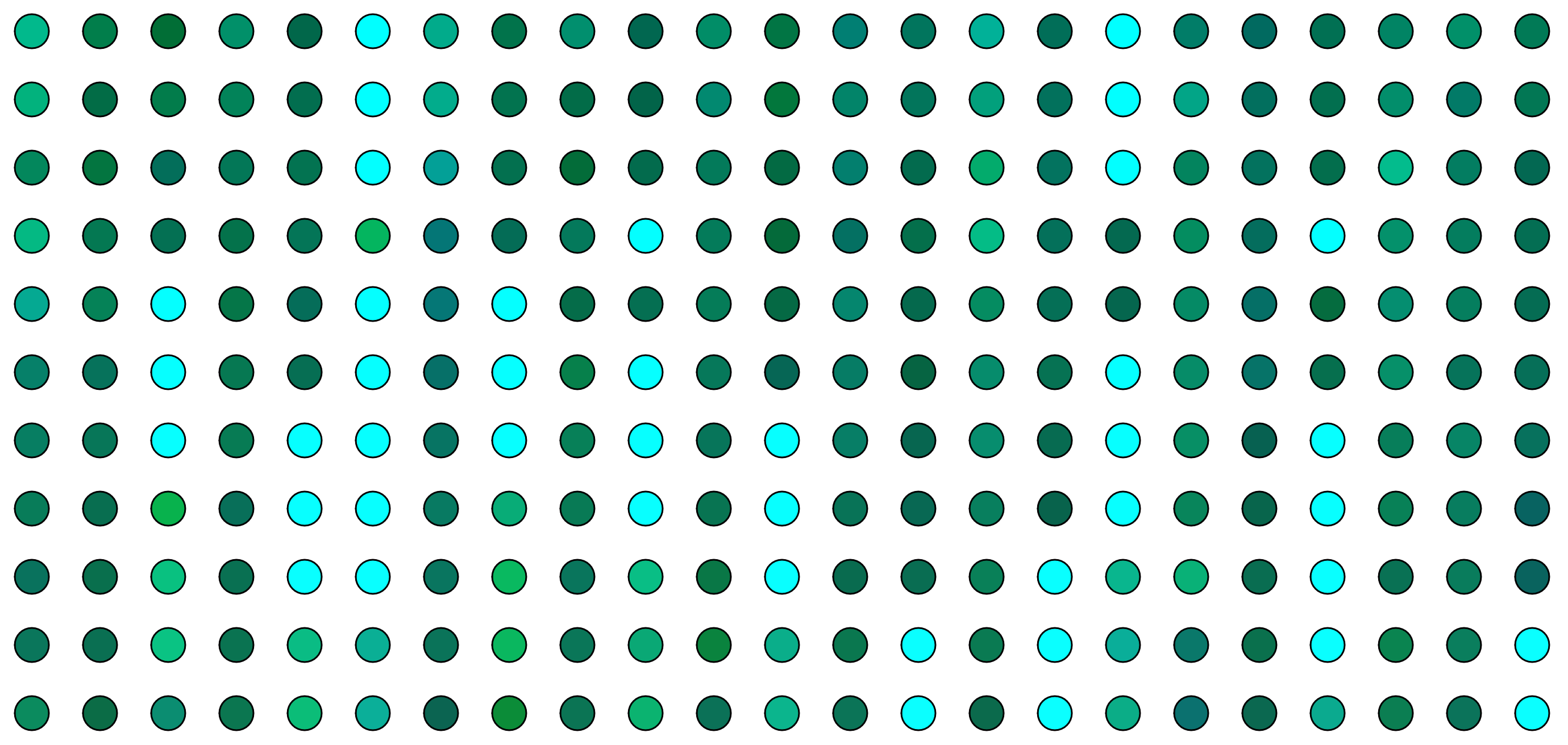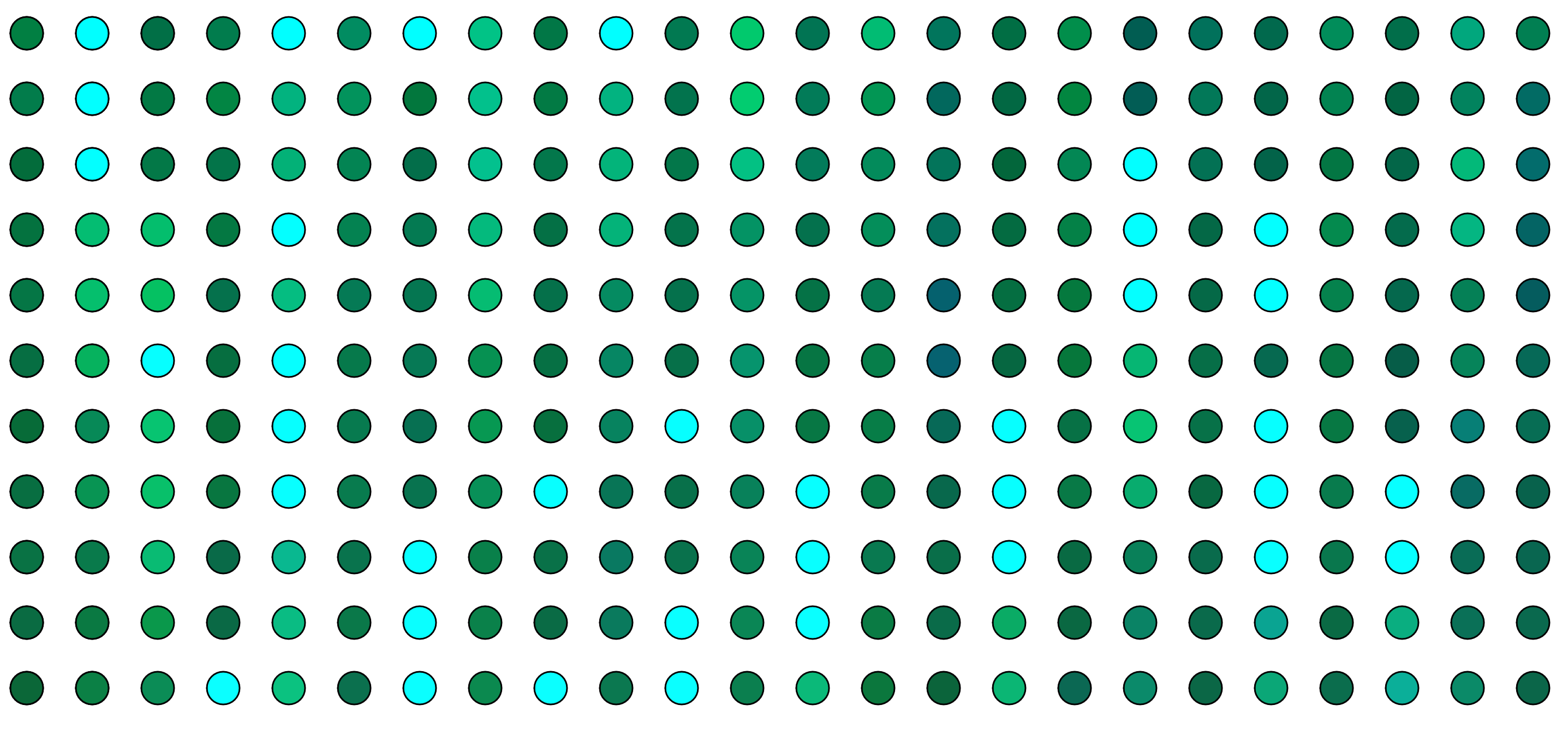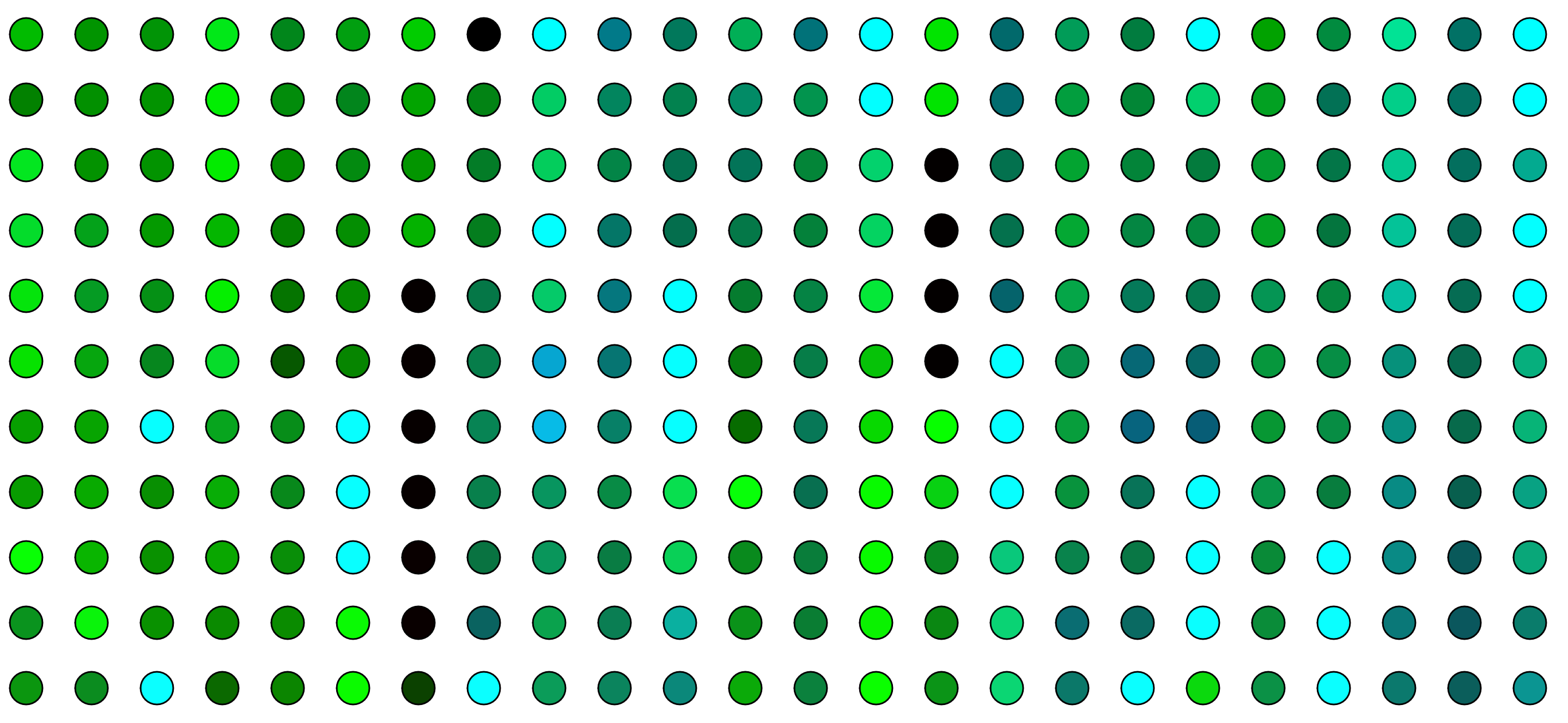 the coloring and intensity of the colours depending on the noise. The spacing between circles is something I changed drastically for my last piece. The large distances made the previous pieces feel to “airy” and make it lose impact per bubble and readability.